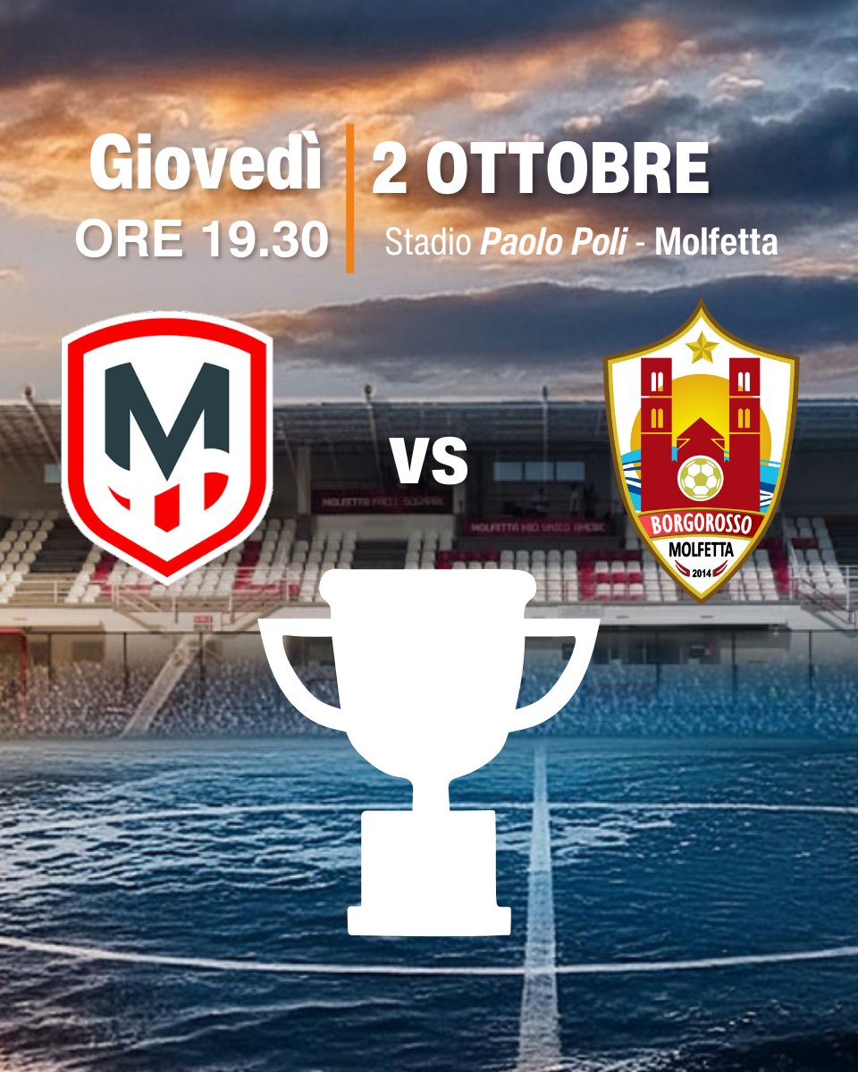 🏆 Coppa Italia Promozione – Gara di ritorno 📅 Giovedì 2 ottobre 🕢 Ore 19:30 🏟 Stadio Paolo Poli, Molfetta La Molfetta Calcio ospita il Borgorosso Molfetta nella gara di ritorno di Coppa. All’andata gli ospiti si sono imposti per 3-1: servirà quindi una grande prestazione per ribaltare il risultato e continuare il cammino nella competizione. 🔴⚪Una sfida da vivere fino all’ultimo minuto. 🎟️ Acquista ora il tuo biglietto https://www.ciaotickets.com/it/biglietti/molfetta-calcio-borgorosso-molfetta-0 *PER TUTTI I POSSESSORI DELL’ABBONAMENTO RICORDIAMO CHE NON E’ VALIDO PER L’INGRESSO RELATIVO ALLE GARE DI COPPA ITALIA* #MolfettaCalcio #CoppaItaliaPromozione #ForzaMolfetta