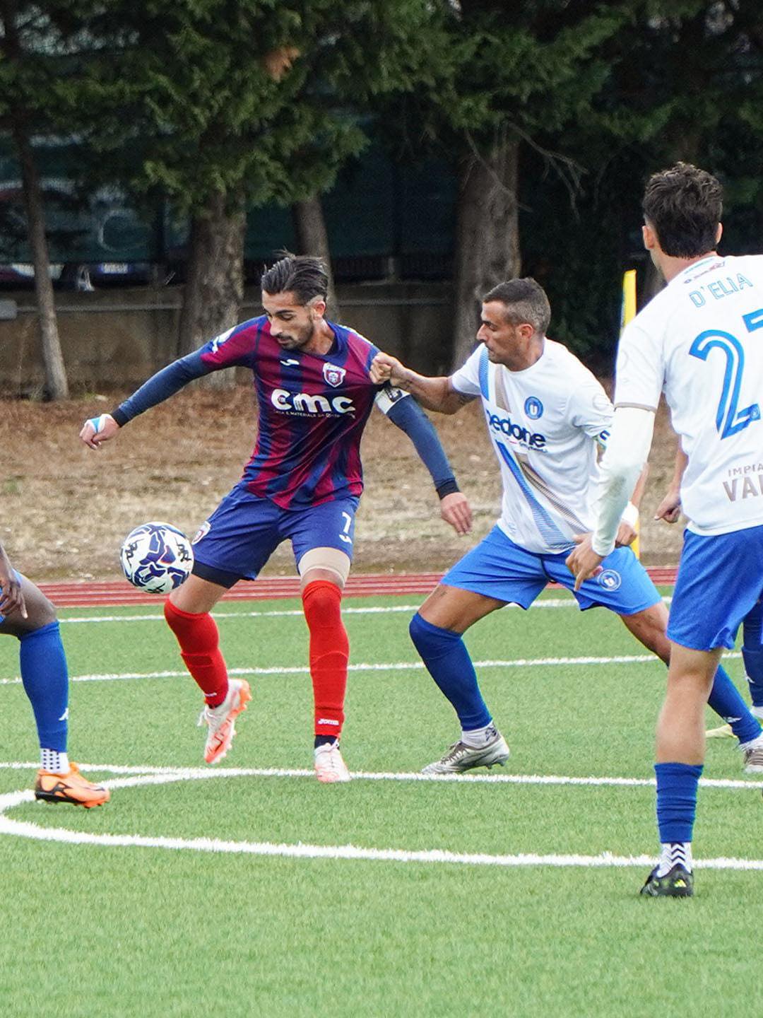 Gli azzurri partono bene, tant’è che sfiorano anche il vantaggio al 7′, per ironia della sorte, con Ramos; che calcia una punizione dal limite dell’area con una conclusione bassa e angolata, che impegna Bozzi. Poi, al 13′, l’evento che cambia la partita: Ramos colpisce in volto il difensore avversario Colaci in una situazione di mischia sotto gli occhi dell’arbitro Mattia Celi, che mostra prontamente il cartellino rosso all’ex Polimnia. Espulsione che, di fatto, consegna il pallino del gioco ai padroni di casa, che si rendono subito pericolosi al 19′ con Fernandez, che anticipa i difensori azzurri nel gioco aereo e colpisce di testa non trovando la porta.