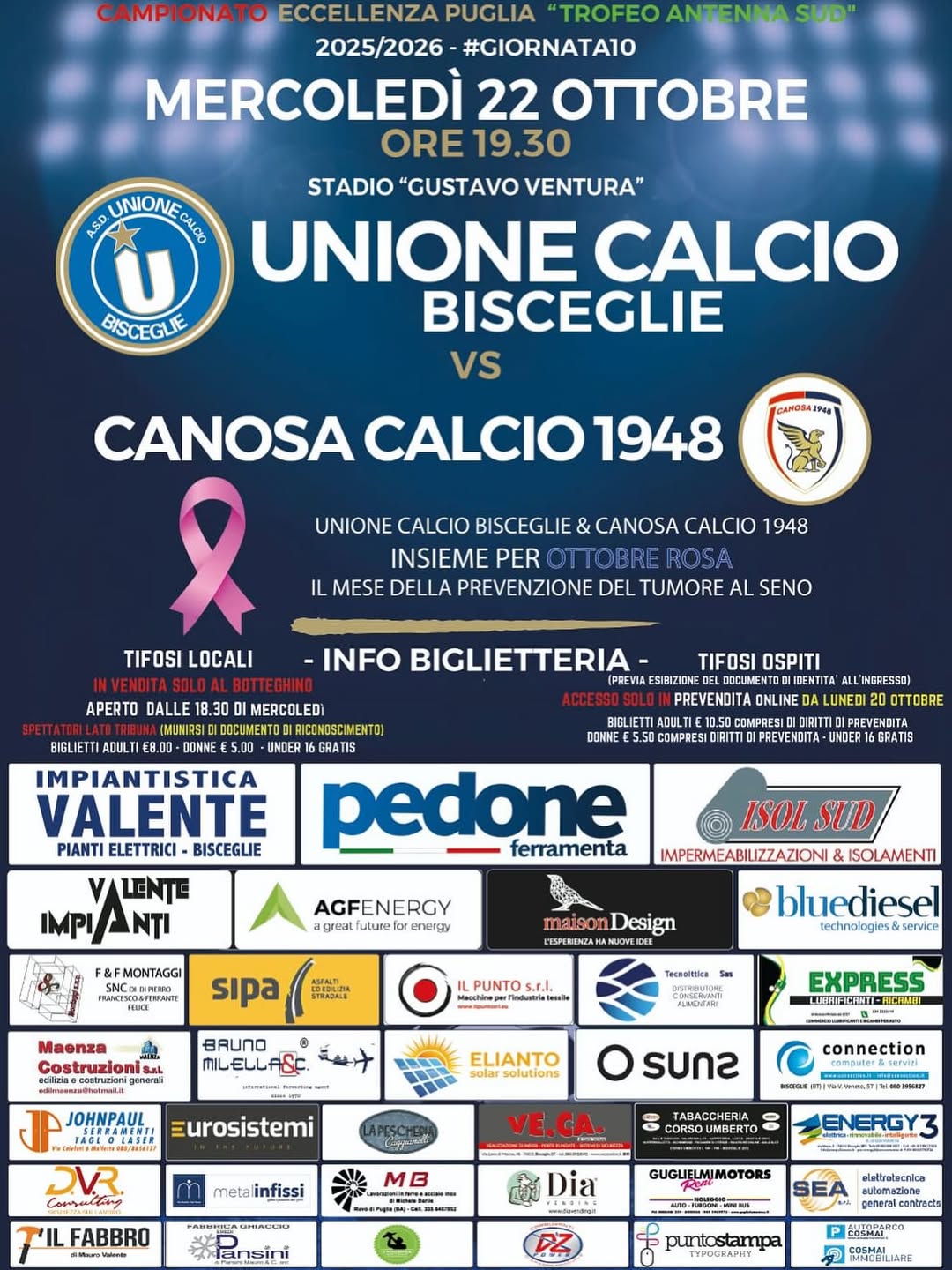 ๐ŸŽŸ๏ธ ๐“๐ฎ๐ญ๐ญ๐จ ๐ช๐ฎ๐ž๐ฅ๐ฅ๐จ ๐œ๐ก๐ž ๐๐ž๐ฏ๐ข ๐ฌ๐š๐ฉ๐ž๐ซ๐ž ๐ฉ๐ž๐ซ ๐š๐ฌ๐ฌ๐ข๐ฌ๐ญ๐ž๐ซ๐ž ๐š ๐”๐ง๐ข๐จ๐ง๐ž ๐‚๐š๐ฅ๐œ๐ข๐จ ๐ฏ๐ฌ ๐‚๐š๐ง๐จ๐ฌ๐š ๐Ÿ† ECCELLENZA PUGLIESE-TROFEO DISTANTE GROUP ๐Ÿ“† 10^giornata – 22/10/2025 ๐Ÿ“Stadio โ€œGustavo Venturaโ€ – Bisceglie โฐ Ore 19:30 ๐Ÿ’ถInformazioni sui biglietti consultabili in grafica Ingresso gratuito per diversamente abili e un accompagnatore, previo invio della necessaria documentazione allโ€™indirizzo mail della biglietteria. ๐ŸŽค Accrediti stampa, fotografi, AlA e osservatori, sono ottenibili, previo invio di una mail entro e non oltre le ore 12.00 del giorno 21 ottobre allโ€™indirizzo biglietteriaunione@libero.it โ—๏ธ ๐’๐ข ๐ซ๐š๐œ๐œ๐จ๐ฆ๐š๐ง๐๐š ๐š ๐ญ๐ฎ๐ญ๐ญ๐ข ๐ ๐ฅ๐ข ๐ฌ๐ฉ๐ž๐ญ๐ญ๐š๐ญ๐จ๐ซ๐ข, ๐ฌ๐ข๐š ๐ฅ๐จ๐œ๐š๐ฅ๐ข ๐œ๐ก๐ž ๐จ๐ฌ๐ฉ๐ข๐ญ๐ข, ๐๐ข ๐ฉ๐จ๐ซ๐ญ๐š๐ซ๐ž ๐œ๐จ๐ง ๐ฌ๐žฬ ๐ฎ๐ง ๐๐จ๐œ๐ฎ๐ฆ๐ž๐ง๐ญ๐จ ๐๐ข ๐ซ๐ข๐œ๐จ๐ง๐จ๐ฌ๐œ๐ข๐ฆ๐ž๐ง๐ญ๐จ ๐ฏ๐š๐ฅ๐ข๐๐จ ๐๐š ๐ž๐ฌ๐ข๐›๐ข๐ซ๐ž ๐š๐ฅ๐ฅโ€™๐ข๐ง๐ ๐ซ๐ž๐ฌ๐ฌ๐จ ๐๐ž๐ฅ๐ฅ๐จ ๐ฌ๐ญ๐š๐๐ข๐จ.