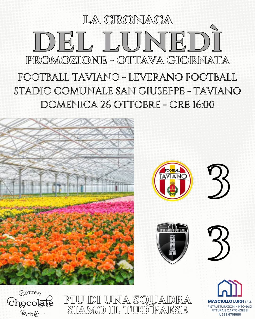 Sfuma nel finale l’impresa del Leverano Football, che nell’ottava giornata di campionato accarezza il colpaccio sul campo della capolista Football Taviano, ma si fa raggiungere per ben tre volte in una partita ricca di emozioni e colpi di scena. Il primo tempo è equilibrato, con i padroni di casa più propositivi ma imprecisi sotto porta. Il Leverano tiene bene il campo e, alla prima vera occasione, colpisce: è Magoia, con un perfetto colpo di testa, a firmare lo 0-1 che manda le squadre al riposo con gli ospiti in vantaggio. In avvio di ripresa il Taviano reagisce con decisione e trova il pareggio grazie a Gennari, bravo a ribadire in rete in mischia per l’1-1. Il Leverano non si scompone e, dopo dieci minuti, torna avanti con Vaschetto, che da fuori firma l’1-2. Ma la gioia dura poco: ancora Gennari, in grande giornata, ristabilisce subito la parità con la rete del 2-2. La partita resta aperta fino all’ultimo, e al minuto 85 è Laena a riportare avanti il Leverano con un destro preciso che vale il 2-3. Sembra fatta, ma nel forcing finale il Taviano trova il pareggio definitivo: Iurato inventa un eurogol da fuori area che si insacca all’incrocio, fissando il risultato sul 3-3. Un pareggio amaro per il Leverano, che può comunque uscire dal campo a testa alta dopo una prova di carattere e qualità contro la prima della classe. #leverano #leveranofootball #bianconero #promozione #promozionepugliese #settoregiovanile #scuolacalcio