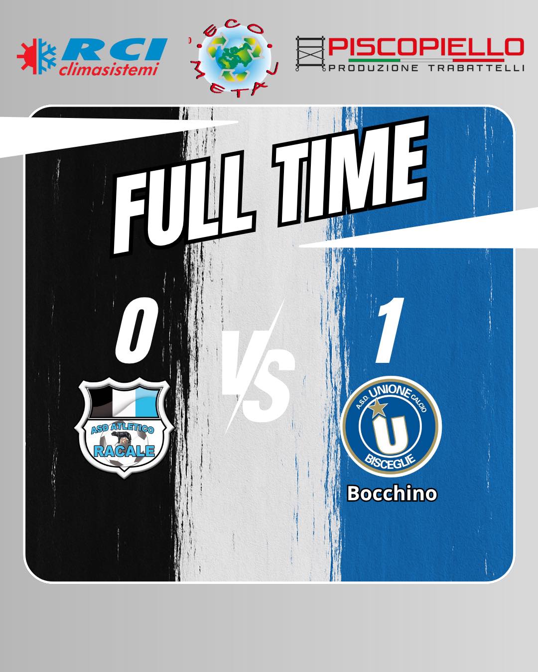 L’U.C. Bisceglie trova il vantaggio al 1’ minuto, poi al 15’ l’Atletico Racale resta in dieci per un’espulsione a dir poco severa ai danni di De Vito (fallo da ultimo Uomo? Non era assolutamente fallo e le riprese televisive lo certificano!). La incomprensibile decisione dell’arbitro ha fortemente condizionato la gara! Nonostante l’inferiorità numerica, la squadra tiene testa con orgoglio: una grande parata del portiere della US Bisceglie Lullo e un palo colpito dal bomber Barbero negano il meritatissimo pareggio.
