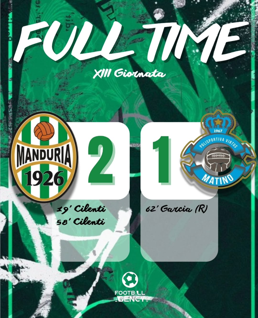 Il Manduria conquista tre punti pesantissimi superando il Matino 2-1 al termine di una gara intensa, combattuta e ricca di emozioni. Protagonista assoluto dell’incontro è Cilenti, autore di una brillante doppietta che decide il match e accende il pubblico di casa. Fin dai primi minuti le due squadre si affrontano a viso aperto, mostrando subito la volontà di imporre il proprio gioco.