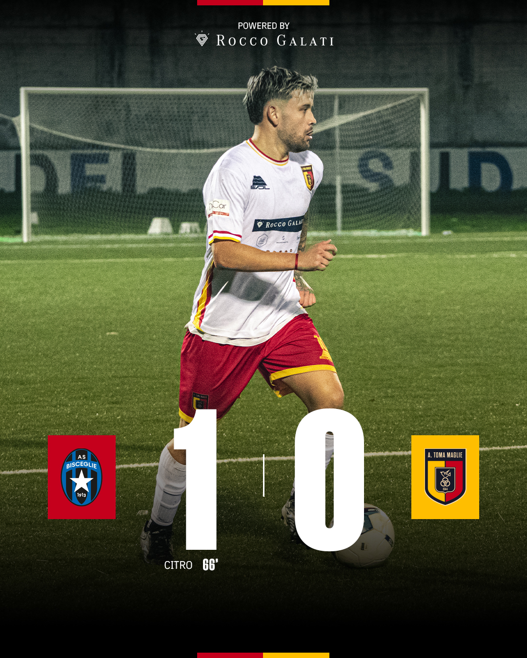 Nella ripresa parte forte il Bisceglie, ma la retroguardia magliese chiude ottimamente. Come nell’ultima gara contro l’Acquaviva, viene confermata la regola del “gol sbagliato, gol subito”. Oltremarini al 64′ ha sui piedi il tiro che potrebbe valere il vantaggio, ma Baietti salva il risultato. Nel capovolgimento di fronte Citro, appena entrato dalla panchina, risolve una mischia in area e insacca la rete dell’1 a 0. Cinque minuti più tardi Oltremarini, completamente da solo e lanciato a rete, dribbla Baietti in uscita che però tocca con la mano fuori area: rosso diretto per l’estremo difensore nerazzurro. Il Maglie spinge sull’acceleratore, ma inutilmente. All’ottantesimo il Direttore di gara riequilibra le forze in campo: anche Galvez finisce negli spogliatoi per doppio giallo.
