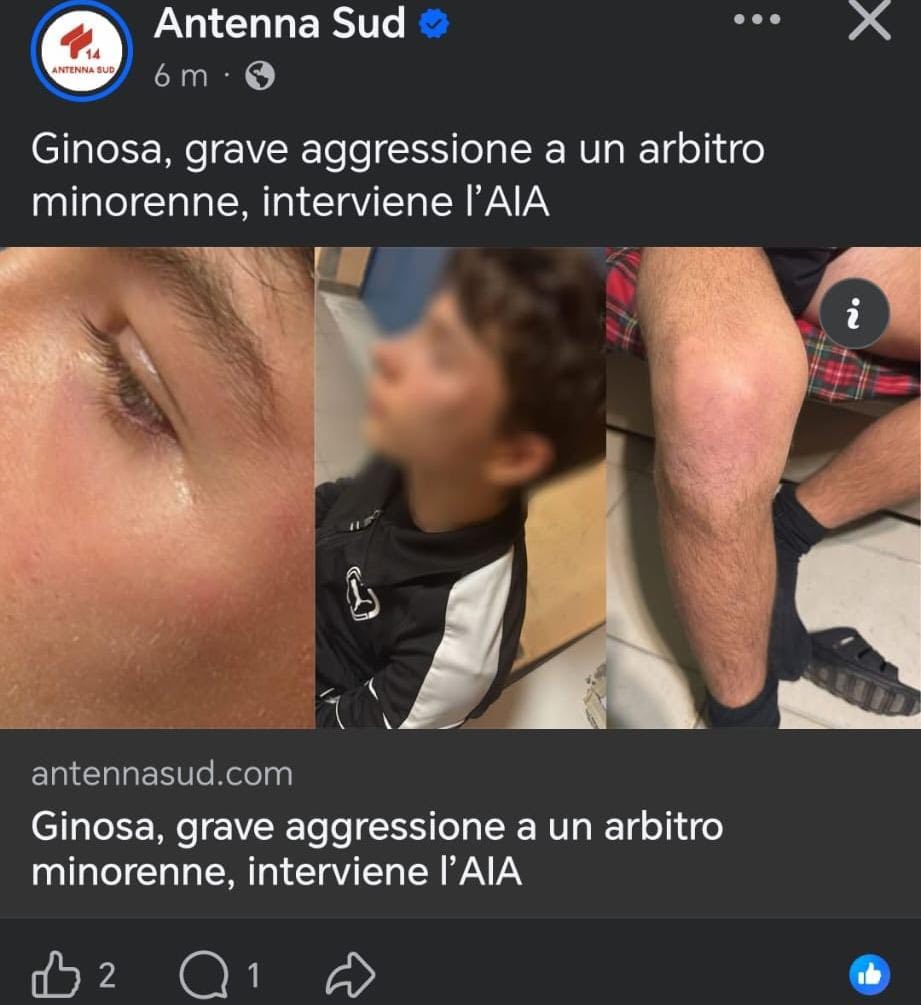 La notizia dellβaggressione al giovane arbitro Nicola Antonio Pio Russo, 15 anni della Sezione di Taranto durante la gara del Campionato Under 16 disputato sabato scorso allo Stadio Teresa Miani di Ginosa tra la formazione dellβA.S. Ginosa e Hellas Laterza terminata con la vittoria del Ginosa per 3-0 sta avendo rilevanza nazionale. La societΓ Biancazzurra del Ginosa vuole chiarire questo brutto episodio di Violenza condannando quello che Γ¨ accaduto in campo e soprattutto quello che Γ¨ successo a fine gara.