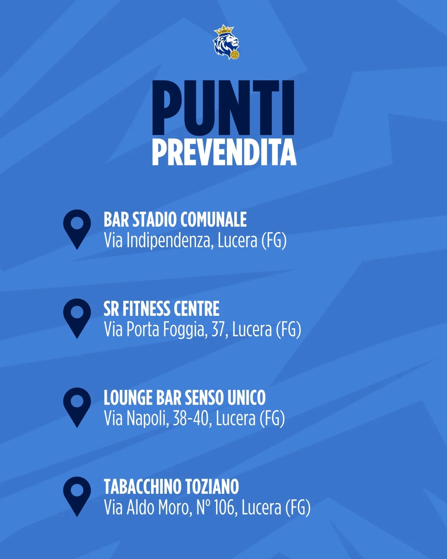 Ecco ๐๐๐๐๐ฒ ๐น๐ฒ ๐ถ๐ป๐ณ๐ผ per assistere alla 15ยช giornata di campionato al Comunale di Lucera (fischio d’inizio Domenica 14 Dic alle ore 14:30):