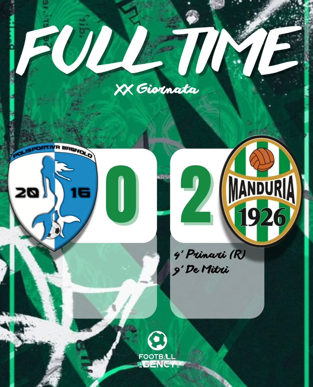 Il Manduria non si ferma e poco dopo trova il raddoppio con De Mitri che risolve in rete una mischia in area di rigore.