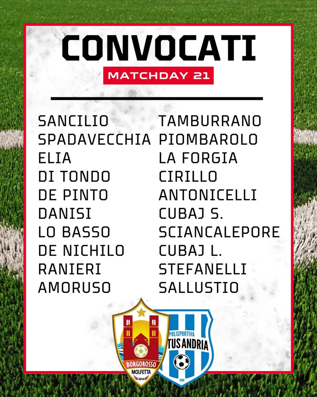 x-altre-squadreBorgorosso MolfettaMolfetta SportivaPromozionePromozione Pugliese Girone A Borgorosso Molfetta – I convocati per la sfida contro la 𝗩𝗶𝗿𝘁𝘂𝘀 𝗔𝗻𝗱𝗿𝗶𝗮 24 Gennaio 2026 21 Share FacebookTwitterWhatsAppLinkedinTelegram I convocati per la sfida contro la 𝗩𝗶𝗿𝘁𝘂𝘀 𝗔𝗻𝗱𝗿𝗶𝗮#ForzaBorgorosso #Puglia #Promozione #Molfetta Fonte: Facebook official page