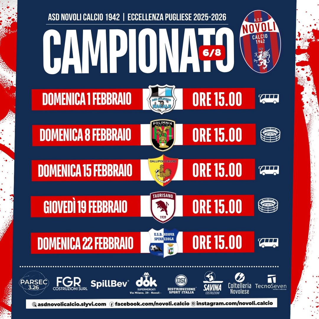 Il mese di febbraio sarà importante per il Novoli Calcio, chiamato a concretizzare tutti gli sforzi messi in atto finora e decidere il suo destino, dopo un bel girone di andata e qualche difficoltà nella prima parte del girone di ritorno. Attese 5 gare dal valore inestimabile per l’obiettivo salvezza, a partire da domenica 1, secondo impegno in trasferta per gli uomini di mister Luperto, chiamati ad espugnare il Basurto di Racale, vero fortino dell’Atletico RACALE. Al “Toto Cezzi” si giocherà due volte: domenica 8 si ospiterà il Polimnia Calcio e giovedì 19, per il secondo infrasettimanale del ritorno, contro l’Asd Taurisano 1939. Difficili le due trasferte che attendono i rossoblù, che saranno ospiti al Bianco del Gallipoli Calcio domenica 15 febbraio e al “Fasciano” ospiti dell’U.S.D Nuova Spinazzola, domenica 22 febbraio.