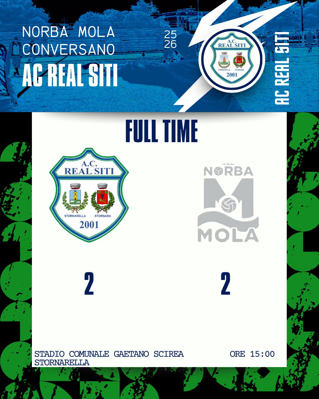 Si chiude con un pareggio amaro allo Stadio Comunale “Gaetano Scirea” una sfida che sembrava saldamente nelle mani dei nostri ragazzi. Dopo un primo tempo dominato e chiuso sul doppio vantaggio grazie alle reti di Rotondo e Pugliese, la ripresa ha visto il ritorno della Norba Mola che è riuscita a strappare il definitivo 2-2.