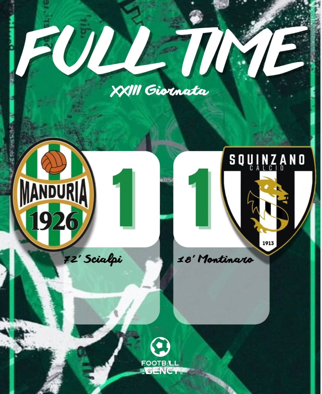 Secondo tempo in cui i biancoverdi scendono in campo determinati a cercare il pareggio, lo trovano con Romano che sugli sviluppi di un calcio di punizione trasforma in rete ma il suo urlo viene strozzato in gola dalla dubbia bandierina alta del guardalinee. Il Manduria non demorde e dalla panchina Tartaglia pesca Cecchin abile a conquistare un sanguinoso calcio di punizione dal limite. Alla battuta va Scialpi che ci ricorda quanto sia bello disegnare traiettorie, palla nel sette e 1 a 1.