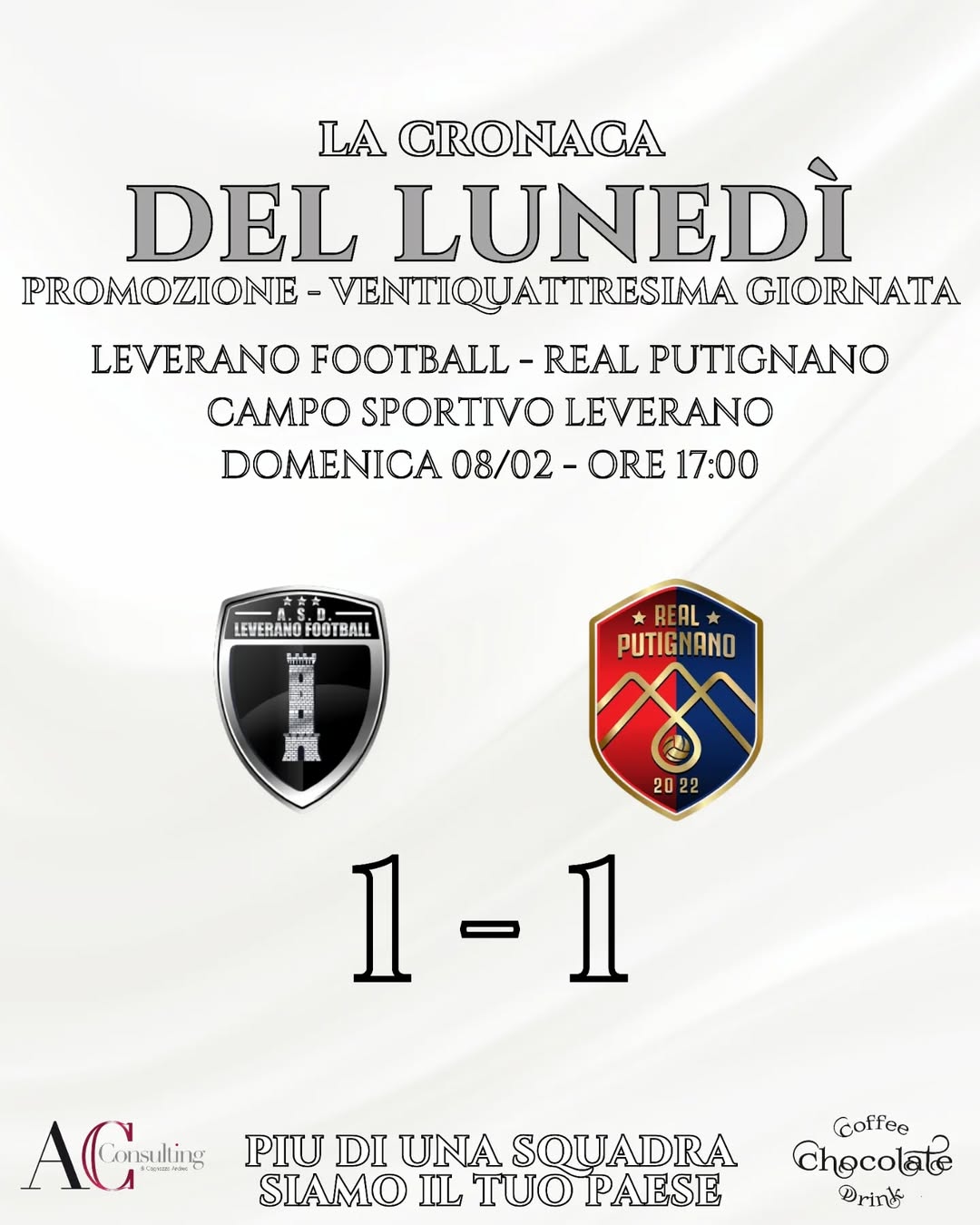 Termina in parità la sfida tra Leverano Football e Real Putignano, che al “Comunale” impattano 1-1.