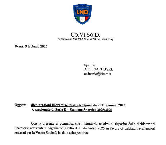 L’AC Nardò comunica che la Co.Vi.So.D., a seguito delle verifiche previste per le società partecipanti al Campionato di Serie D 2025/2026, ha certificato l’esito positivo dell’istruttoria relativa al deposito delle dichiarazioni liberatorie dei tesserati alla data del 31 gennaio 2026.