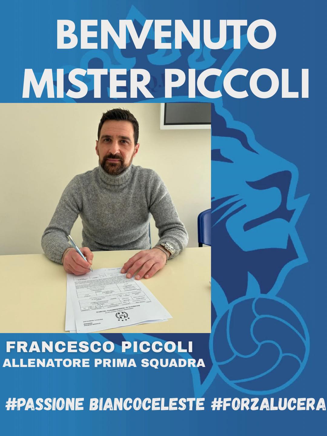 La Lucera Calcio annuncia l’arrivo di Francesco Piccoli come nuovo allenatore biancoceleste a partire da lunedì prossimo.