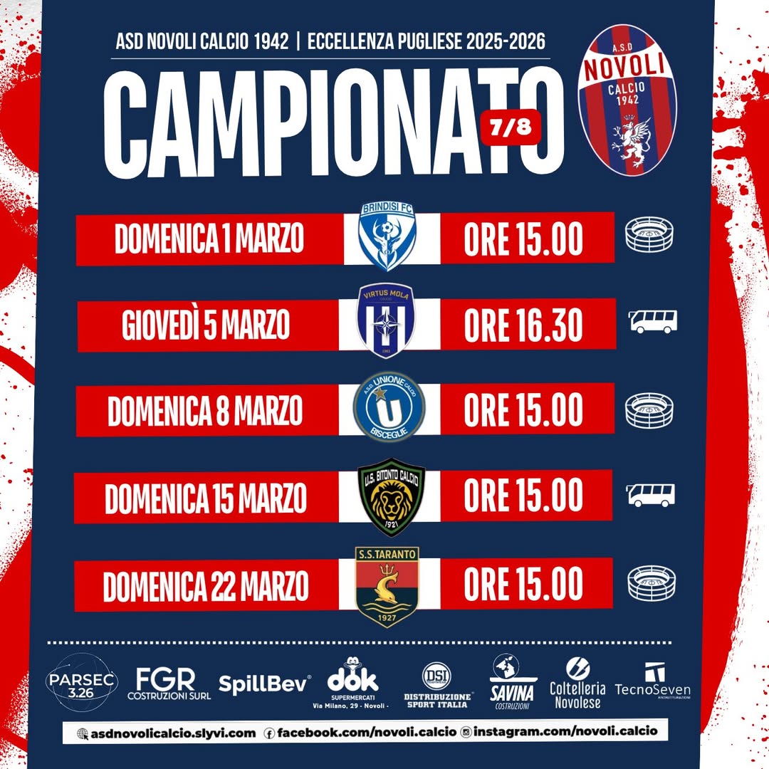 Nella fase cruciale della stagione, il “Girone Unico” di Eccellenza Pugliese mette a dura prova i rossoblù che vengono già da tre gare ufficiali in 8 giorni. Dopo la sfida esterna a Spinazzola, il Novoli Calcio ospiterà al Toto Cezzi il Brindisi Football Club domenica 1 marzo, per una gara storica ma altrettanto difficile considerata la lotta per la Serie D in cui è coinvolta la squadra di Ciullo. Poi un altro turno infrasettimanale, giovedì 5 marzo, contro la ASD Virtus Mola Calcio per poi giocare tre giorni dopo, in casa, contro l’Asd Unione Calcio Bisceglie, una delle belle sorpresa di questa stagione sportiva. Si completa con due gare toste e fondamentali per il cammino di Lobjanidze e compagni: domenica 15 marzo trasferta proibitiva in casa del U.S. Bitonto Calcio, sette giorni dopo si ospita il SS Taranto Calcio, dopo la parentesi di qualche mese fa in Coppa Italia.