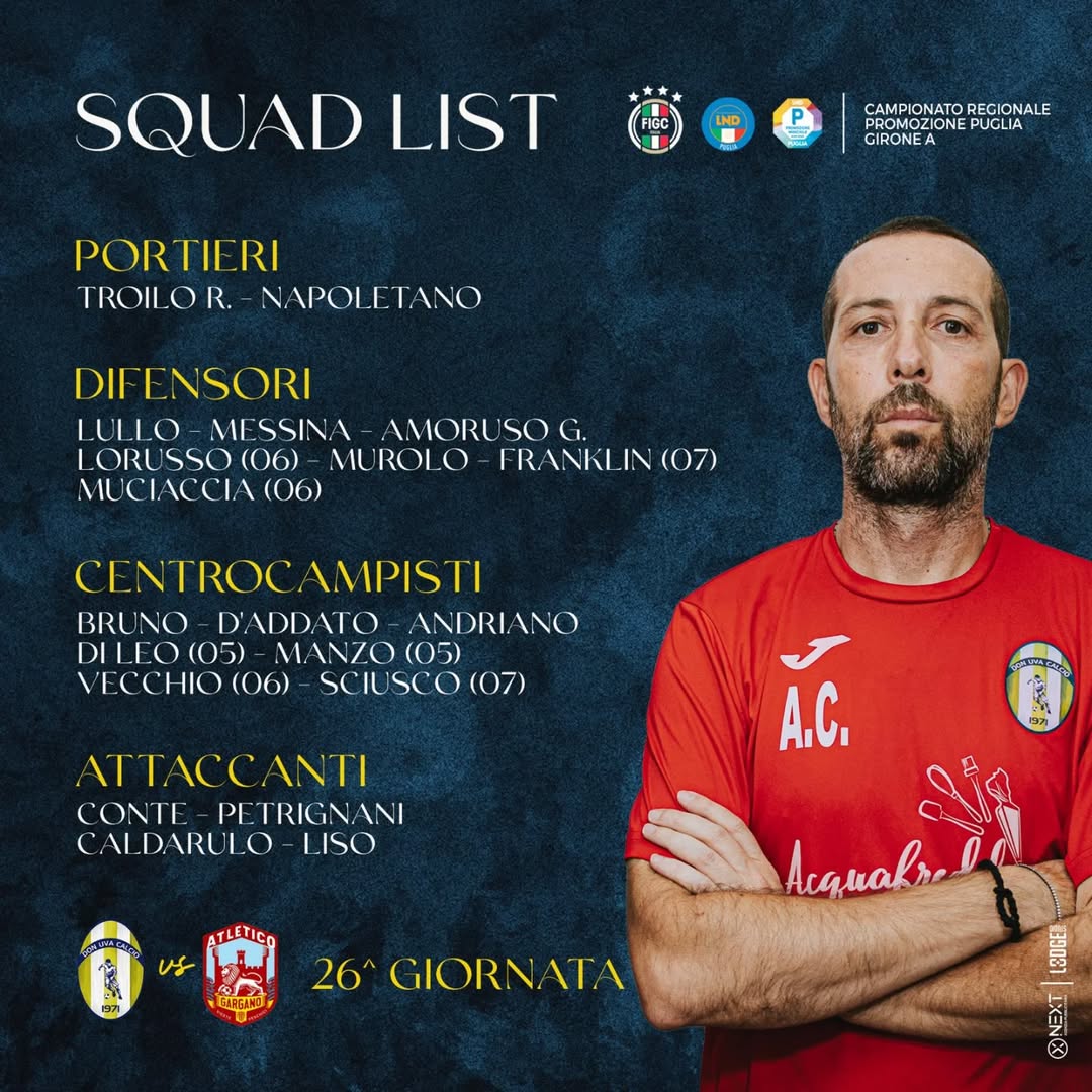 PromozionePromozione Pugliese Girone A Don Uva Calcio – SQUAD LIST Redazione Calciowebpuglia 1 Marzo 2026 25 TagsASD Don Uva Calcio 1971Calcio DilettantiCalcio PuglieseDon UvaFacebook Don Uvapromozione pugliesePromozione Pugliese Girone A Verso Don Uva – Atletico GarganoI convocati di mister Carlucci.#donuvacalcio1971 #promozionepuglia #gironeA Fonte: Facebook official page Share post: FacebookTwitterWhatsAppLinkedinTelegram Popular Como-Lecce 3-1 | HL Serie A Enilive 2025/26 Cosmano Sport Foggia – Mister Fabrizio Mascia ai microfoni di Tiziana Cuttano alla vigilia della gara … Nardò e Fidelis Andria si giocano la stagione Borgorosso Molfetta – I convocati per la sfida contro la 𝗩𝗶𝗿𝘁𝘂𝘀 𝗕𝗶𝘀𝗰𝗲𝗴𝗹𝗶𝗲 Top & Flop di Foggia-Casarano Ti potrebbe interessareRelated Como-Lecce 3-1 | HL Serie A Enilive 2025/26 Redazione Calciowebpuglia - 1 Marzo 2026 Fonte: Lecce Calcio Official youtube channel Cosmano Sport Foggia – Mister Fabrizio Mascia ai microfoni di Tiziana Cuttano alla vigilia della gara … Redazione Calciowebpuglia - 1 Marzo 2026 ⚽️ Mister Fabrizio Mascia ai microfoni di Tiziana Cuttano... Nardò e Fidelis Andria si giocano la stagione Redazione Calciowebpuglia - 1 Marzo 2026 Nel momento cruciale della stagione, quando nel girone H... Borgorosso Molfetta – I convocati per la sfida contro la 𝗩𝗶𝗿𝘁𝘂𝘀 𝗕𝗶𝘀𝗰𝗲𝗴𝗹𝗶𝗲 Redazione Calciowebpuglia - 1 Marzo 2026 👉🏽 I convocati per la sfida contro la 𝗩𝗶𝗿𝘁𝘂𝘀...