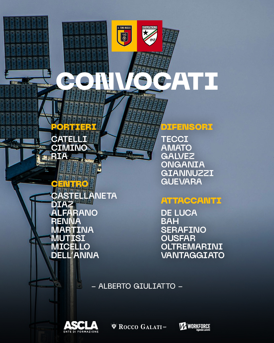 A. Toma MagliePromozionePromozione Pugliese Girone B A. Toma Maglie – I convocati Redazione Calciowebpuglia 1 Marzo 2026 24 TagsASD A. Toma MaglieCalcio DilettantiCalcio PuglieseFacebook Toma MaglieMaglie Calciopromozione pugliesePromozione Pugliese Girone BToma Maglie I convocati da Mister Giuliatto in occasione del derby contro il Galatina, in programma domani alle ore 15:30 Fonte: Facebook official page Share post: FacebookTwitterWhatsAppLinkedinTelegram Popular Como-Lecce 3-1 | HL Serie A Enilive 2025/26 Cosmano Sport Foggia – Mister Fabrizio Mascia ai microfoni di Tiziana Cuttano alla vigilia della gara … Nardò e Fidelis Andria si giocano la stagione Don Uva Calcio – SQUAD LIST Borgorosso Molfetta – I convocati per la sfida contro la 𝗩𝗶𝗿𝘁𝘂𝘀 𝗕𝗶𝘀𝗰𝗲𝗴𝗹𝗶𝗲 Ti potrebbe interessareRelated Como-Lecce 3-1 | HL Serie A Enilive 2025/26 Redazione Calciowebpuglia - 1 Marzo 2026 Fonte: Lecce Calcio Official youtube channel Cosmano Sport Foggia – Mister Fabrizio Mascia ai microfoni di Tiziana Cuttano alla vigilia della gara … Redazione Calciowebpuglia - 1 Marzo 2026 ⚽️ Mister Fabrizio Mascia ai microfoni di Tiziana Cuttano... Nardò e Fidelis Andria si giocano la stagione Redazione Calciowebpuglia - 1 Marzo 2026 Nel momento cruciale della stagione, quando nel girone H... Don Uva Calcio – SQUAD LIST Redazione Calciowebpuglia - 1 Marzo 2026 Verso Don Uva - Atletico GarganoI convocati di mister...