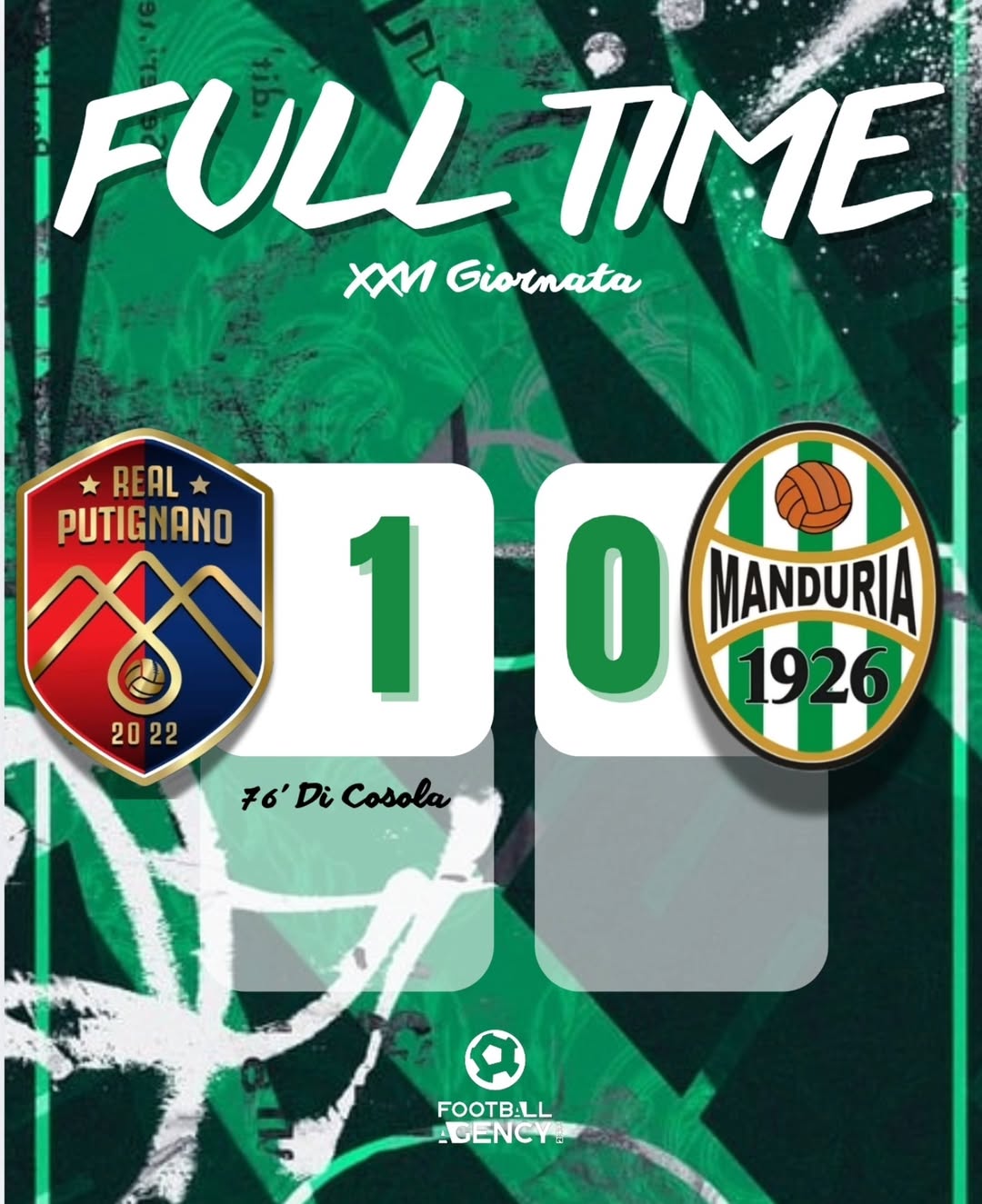 Secondo tempo in cui il copione non cambia, il Manduria crea e ci arriva vicino tante volte senza mai riuscire a timbrare il vantaggio e nel periodo di maggior pressione biancoverde arriva la doccia fredda ed il vantaggio locale con un contropiede ben finalizzato da Di Cosola.