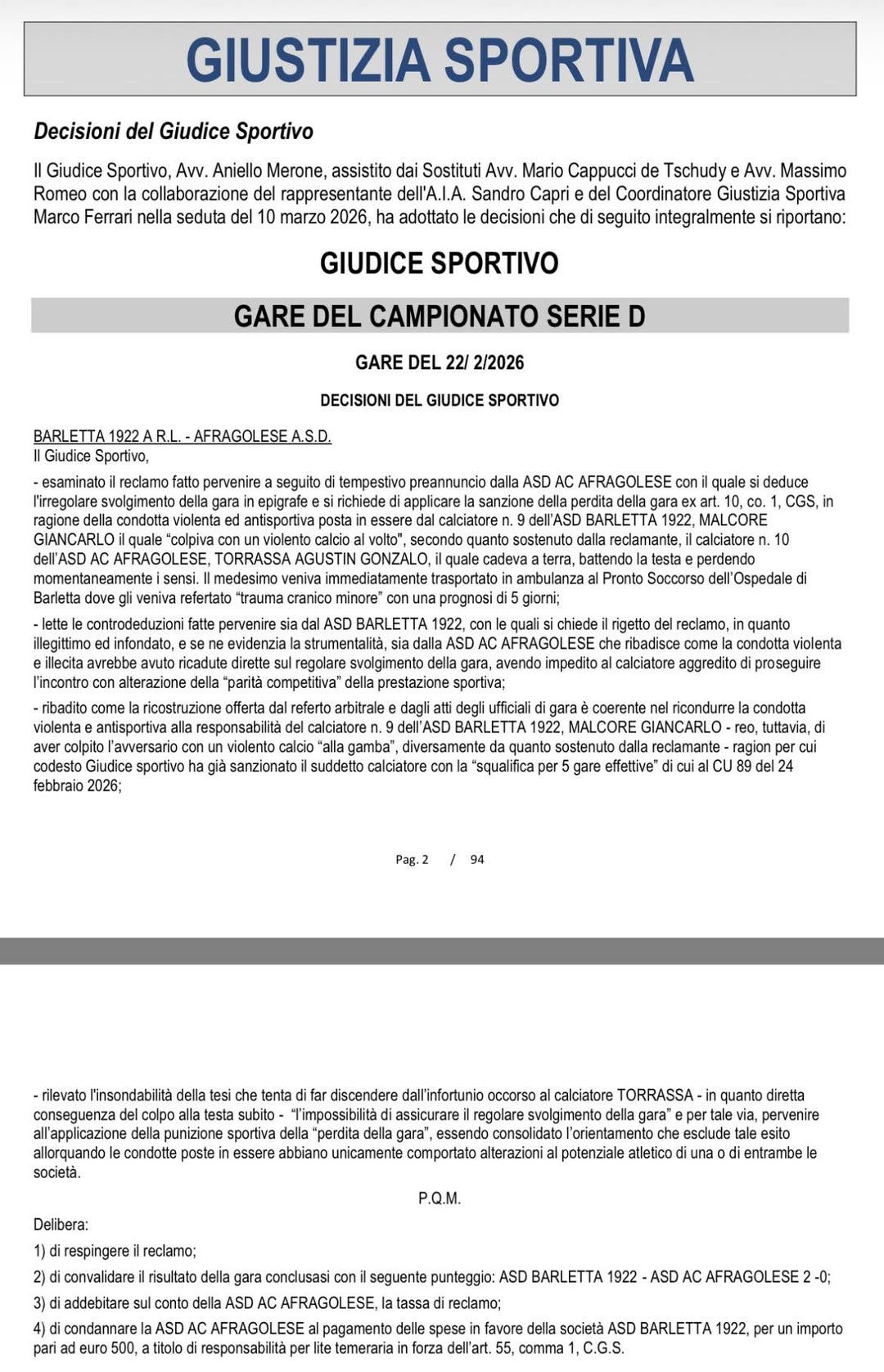 Il ricorso dellโAfragolese รจ stato respinto dal giudice sportivo che ha confermato il 2-0 inflitto sul campo. Questo รจ il verdetto pubblicato in data odierna con il comunicato ufficiale n. 94.
