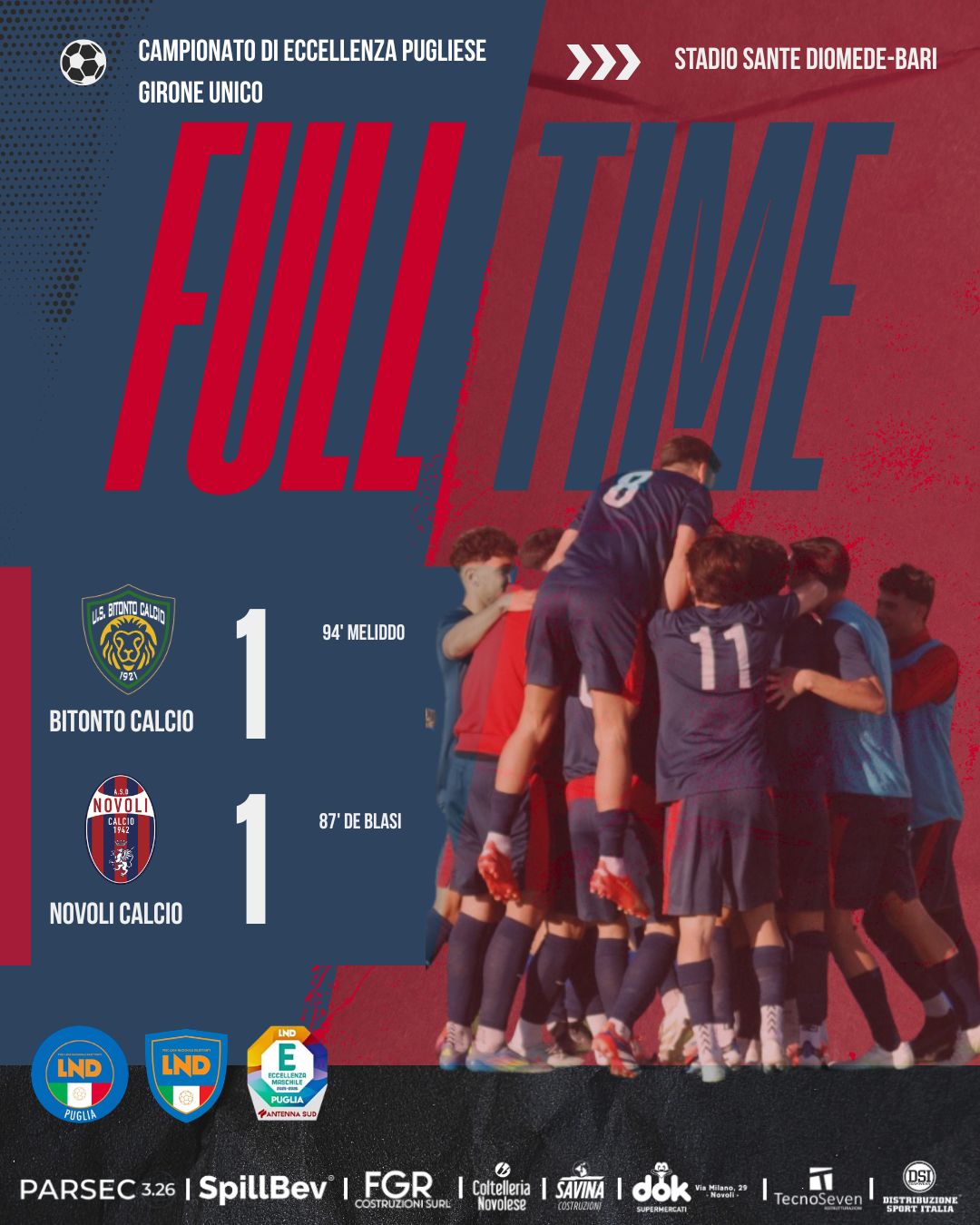 Il Novoli Calcio sfiora il colpaccio al “Sante Diomede”, raggiunto all’ultimo respiro dall’U.S. Bitonto Calcio, che con Meliddo pareggia al 94esimo su mischia da corner il goal in contropiede realizzato da Gabriele De Blasi sul finire dei 90 regolamentari. Secondo tempo al cardiopalma, con ribaltamenti di fronte e occasioni: pronti, via e rossoblù che sprecano l’occasione di un calcio di rigore con Mancarella, ipnotizzato da Cozzella. Poi escono i padroni di casa, vicini al goal con Palazzo che non sfrutta l’errore in disimpegno di Maccarrone.