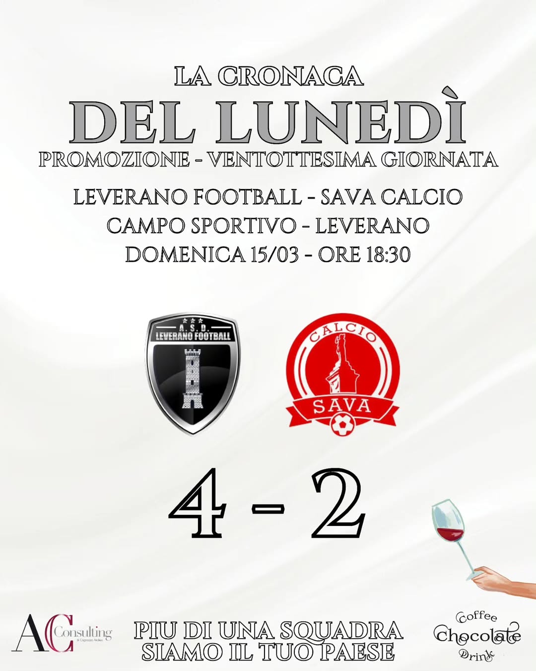 Tre punti pesanti per il Leverano, autore di una prova di carattere e concretezza, capace di reagire anche all’inferiorità numerica e di regalare al suo pubblico una vittoria meritata.