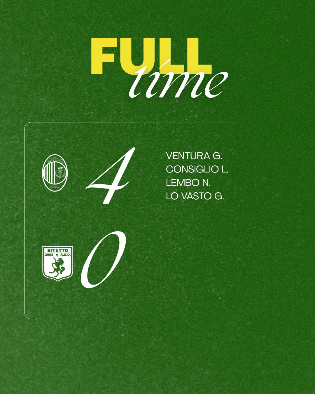 Nella ripresa i gialloverdi chiudono subito i conti: Lembo segna il tris su assist preciso di Ventura, protagonista assoluto, mentre Lovasto cala il poker di testa al 61’, ancora su suo suggerimento.