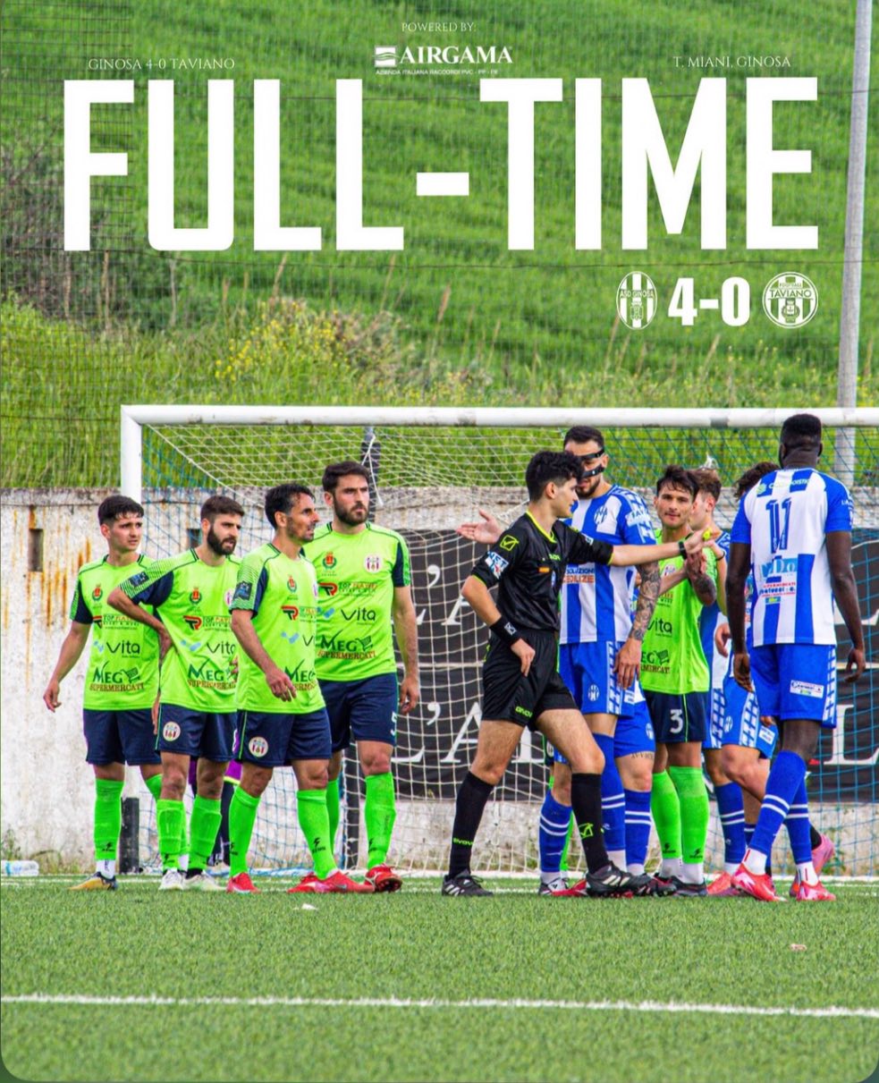 Il Ginosa è ufficialmente salvo. La certezza è arrivata oggi grazie alla vittoria per 4-0 sul Taviano, grazie alla doppietta del bomber SEKA, e alle reti di Mazzarano e Verdano. La formazione di Mister Marsili grazie ad una bella prestazione, con 40 punti in classifica e con tre giornate di anticipo si gusta questa tranquilla salvezza sperando che la prossima stagione si possa raccontare una storia migliore. Il Ginosa ora concluderà la stagione domenica prossima con la trasferta sul campo del Matino, poi ci sarà l’ultima gara al Miani con l’Alberobello per poi chiudere in trasferta a Mesagne.